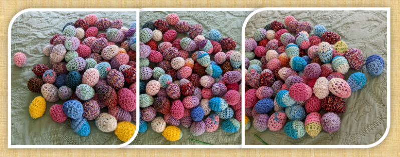 Choose an egg which matches or blends well with the yarn. Place egg inside crochet, bottom-side down.